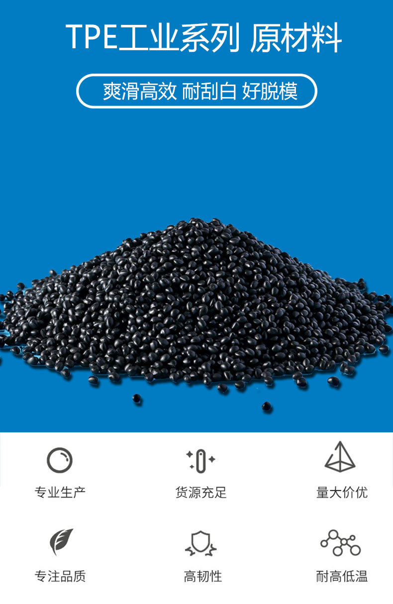 TPE是一種熱塑性彈性體,具有環(huán)保無毒,易著色,手感爽滑柔軟,硬度范圍0A-120A,加工成型簡單,不需要硫化加工,可以循環(huán)再生利用,降低成本。可以與PP、PE、PC、PS、ABS等塑膠材料包覆粘合(二次注塑),也可以單獨成型。