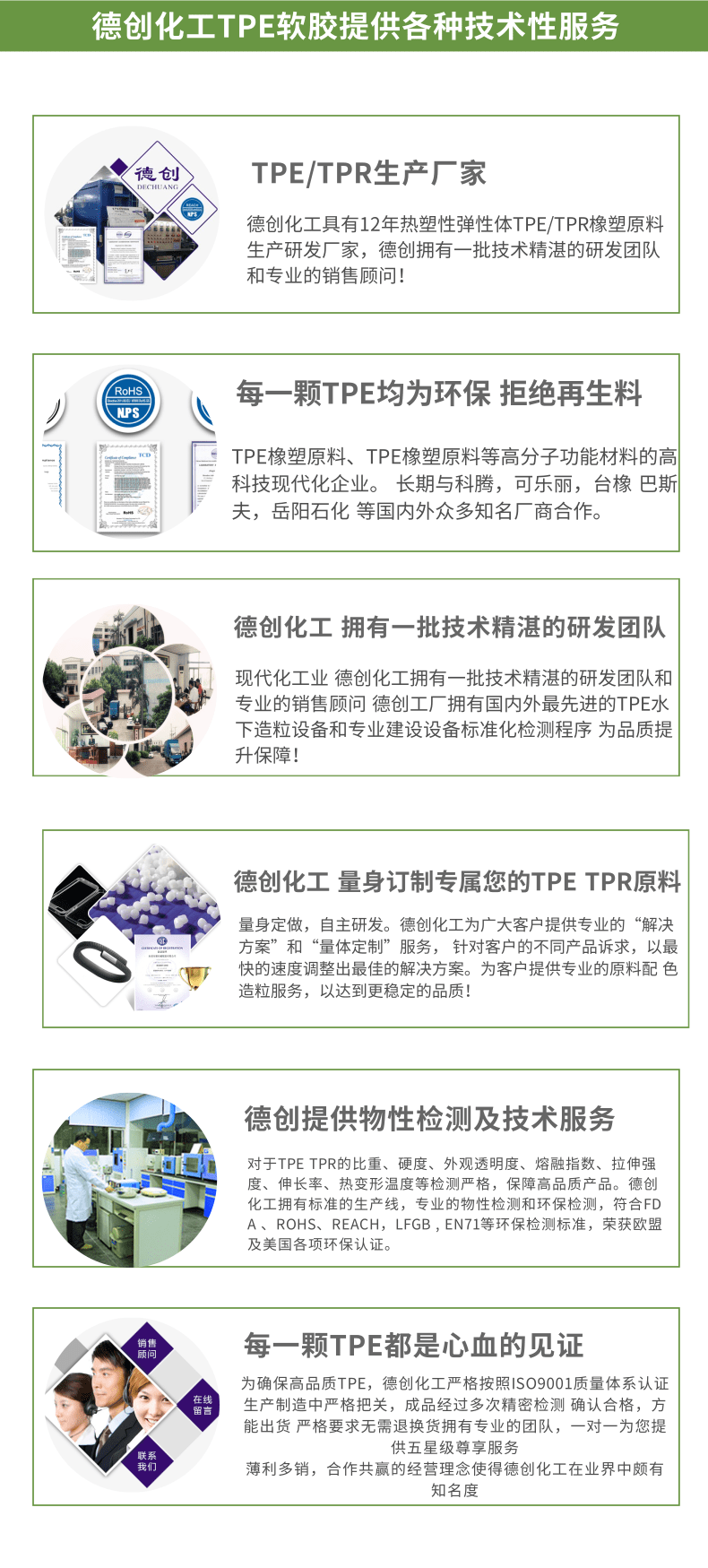 高品質(zhì)的TPE材料具有良好的回彈性和耐磨性。耐溫,硬度好,加工性能好。TPE材料粒子可以與一些膠水有很好的附著力。因此,只有符合這些方面的性能,才能得到高質(zhì)量的TPE粒子。