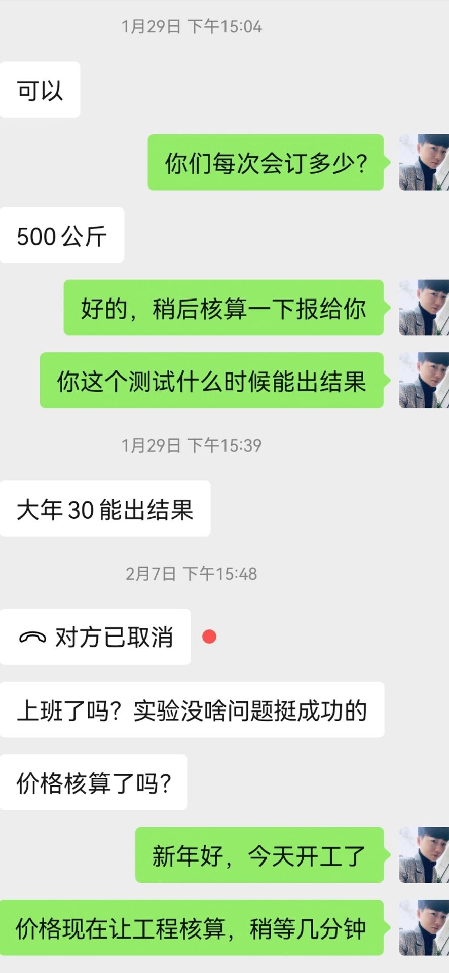 春節(jié)假期過后 ,2022/2/7日剛開工張先生傳來好消息說,實(shí)驗(yàn)挺成功的沒有什么問題,現(xiàn)在先組裝一點(diǎn)做個(gè)整套流程,咨詢了供貨時(shí)間以及材料單價(jià)!首先感謝張先生的認(rèn)可選擇讓德創(chuàng)化工給他們試樣,解決了困擾的問題!