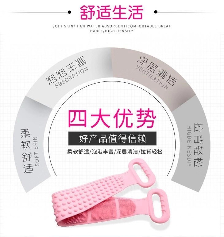 硅膠搓澡巾設計成條狀性,健康環(huán)保不含雙酚A等有害物質,耐高低溫 不易破裂。硅膠搓澡巾,雙面硅膠毛刷;柔軟舒適,輕柔不傷肌膚;柔軟富有彈性。好品質 才有好生活。拉手設計 手握舒服 輕松搓后背,搓出牛奶般美背。掛孔設計 收納方便。消除疲勞 毛刷背面是與橢圓形設計,你的私人按摩師 反面凸起按去您一身疲勞。千根硅膠刷毛層層清潔讓污垢無處容身360°來回深層清潔,搓背按摩不求人。硅膠洗澡刷搓澡好幫手。雙面功能 雙向選擇 刷毛面氣泡搓澡,半球面按摩,沐浴更簡單。